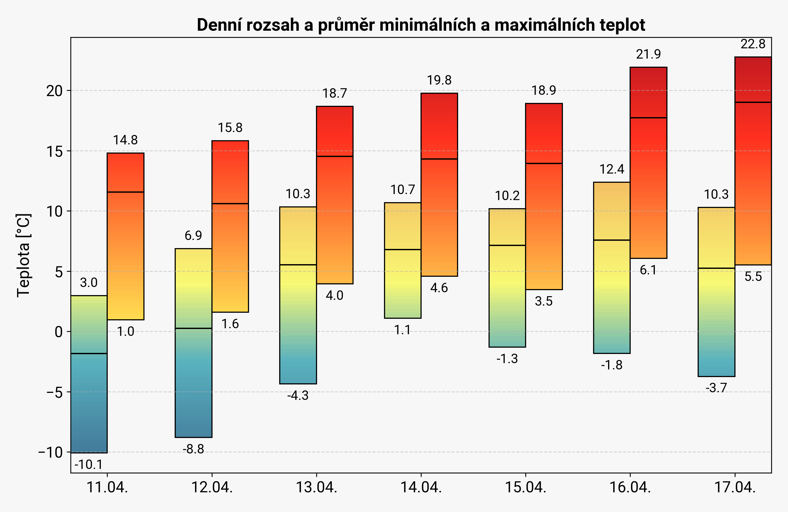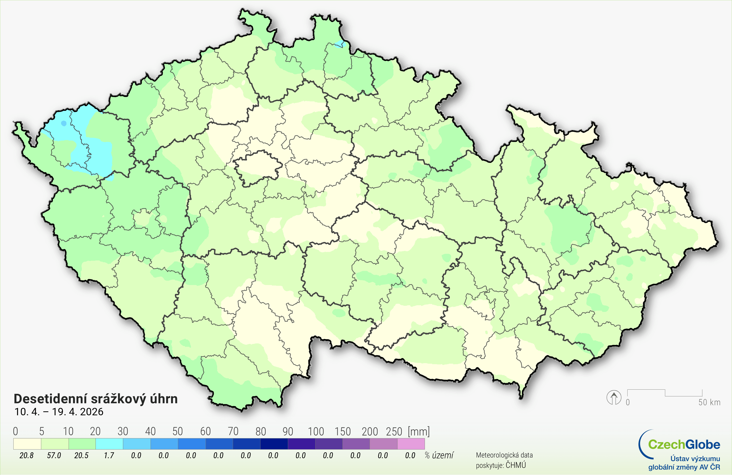 Z uplynulých dní: mapa desetidenního srážkového úhrnu a graf denního rozsahu a průměru maximálních a minimálních teplot.